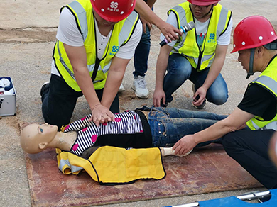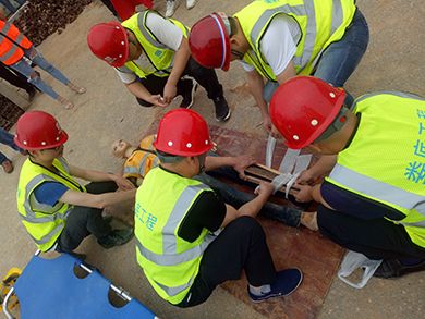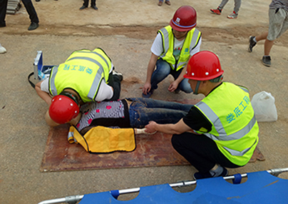 搶救組將傷員移至安全地帶,醫(yī)療救護(hù)組人員檢查傷員情況后,組織組對(duì)傷員進(jìn)行了左小腿夾板和繃帶固定綁扎,并對(duì)傷員進(jìn)行心肺復(fù)蘇和人工呼吸等急救救治